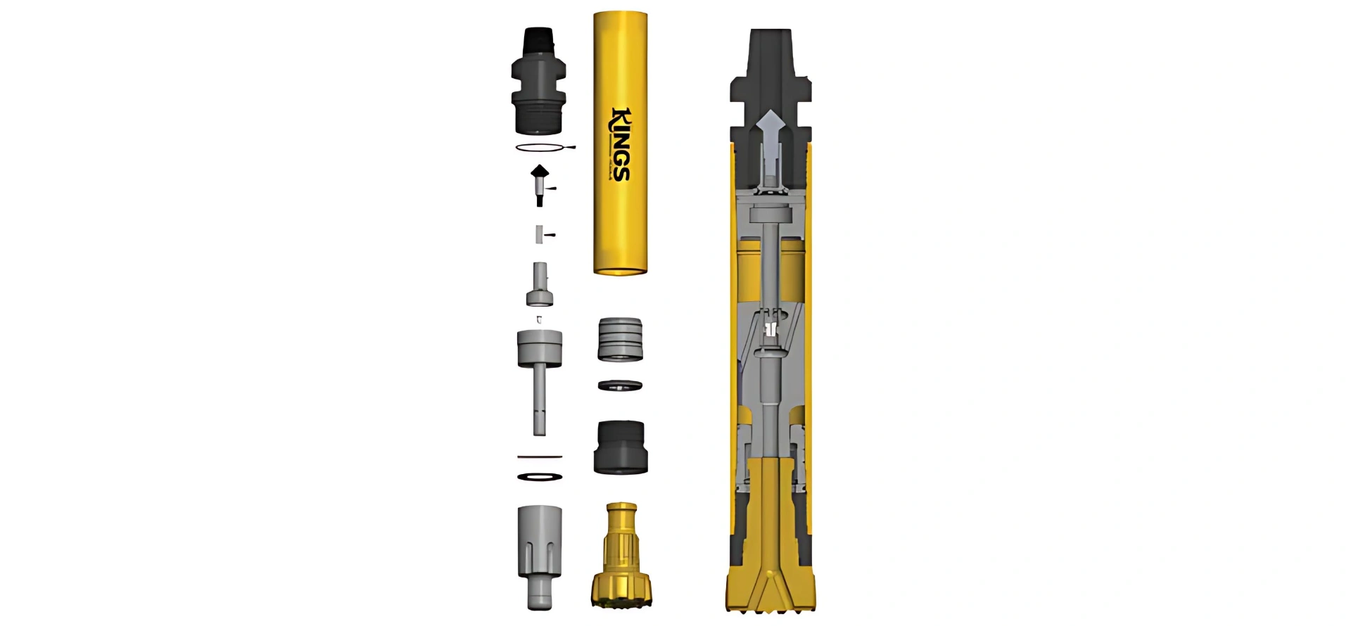 The hammer is designed with an effective air flushing system to cool the piston and bit, a durable non-return valve for stable air pressure, and precision-machined components to enhance longevity. Companies like Kings Mining Tools focus on these advanced features to ensure superior DRILLING TOOL performance.